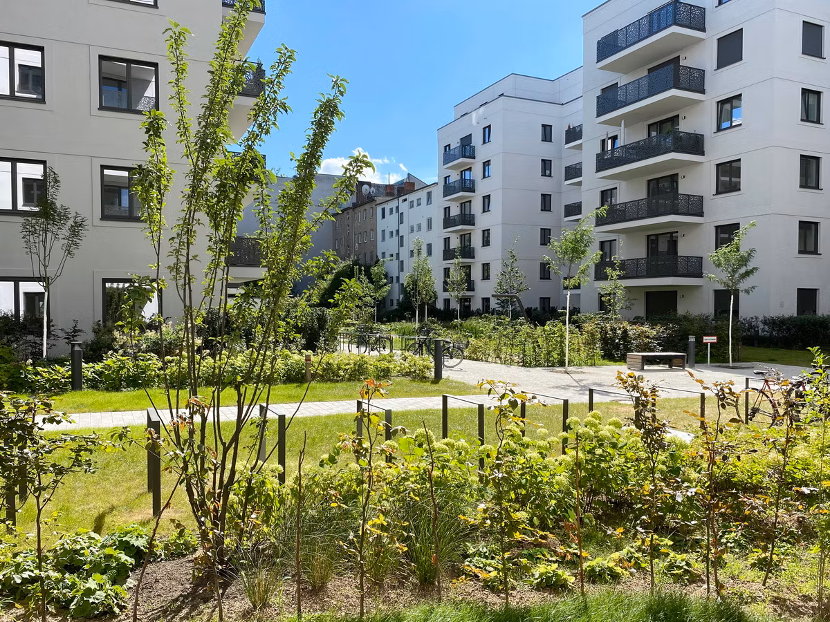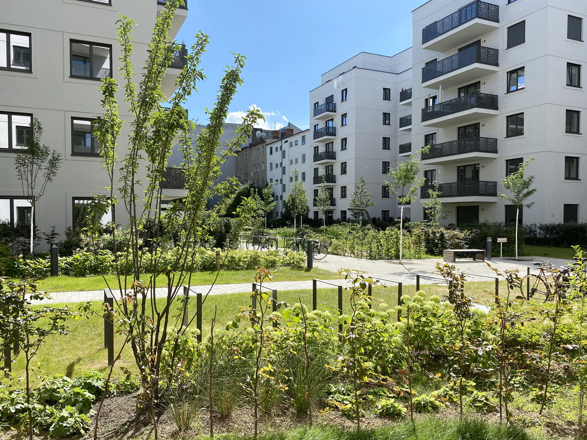 Herzstück des Ensembles ist der ca. 2.650 m² große, gärtnerisch gestaltete Innenhof – ausschließlich den Bewohnern vorbehalten. Er verbindet Spiel- und Ruhebereiche, Aufenthaltszonen und Rückzugsflächen – eingefasst von den sieben Gebäudeteilen des Projekts. Die Erdgeschosswohnungen verfügen teilweise über kleine private Gärten mit Terrassen. Die großflächige Begrünung schafft nicht nur Aufenthaltsqualität, sondern auch ein Mikroklima, das zur Atmosphäre des Quartiers beiträgt.
