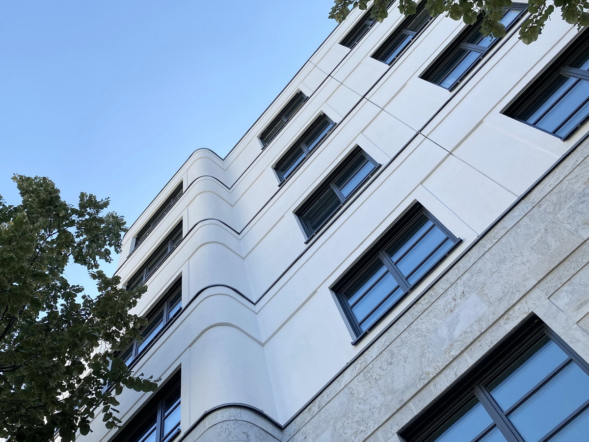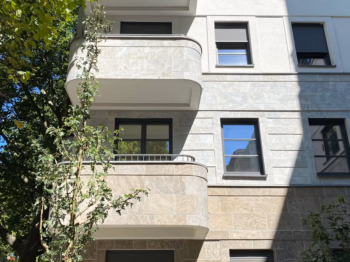 Die Fassaden des Ensembles sind klassisch gegliedert – mit Fensterformaten, Farbtönen und Materialien, die sich an der Nachbarschaft orientieren. Helle Putzflächen, fein abgesetzte Details und ruhige Proportionen prägen das Erscheinungsbild. Balkone, Loggien und Terrassen sind in die Architektur integriert und folgen dem gestalterischen Gesamtrahmen – funktional wie formal. Die klare Fassadenstruktur unterstreicht den ruhigen Ausdruck des Ensembles – zurückhaltend in der Wirkung, aber dauerhaft im Stadtbild verankert.
