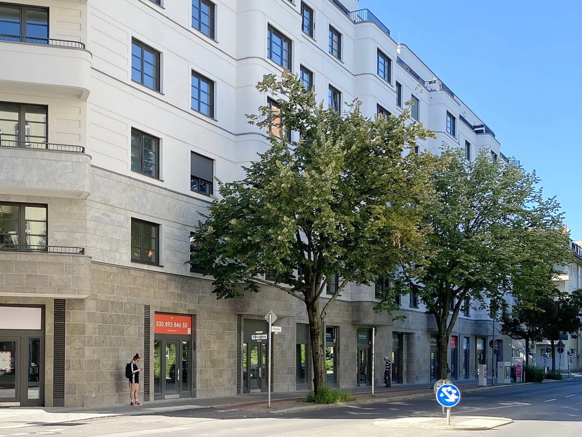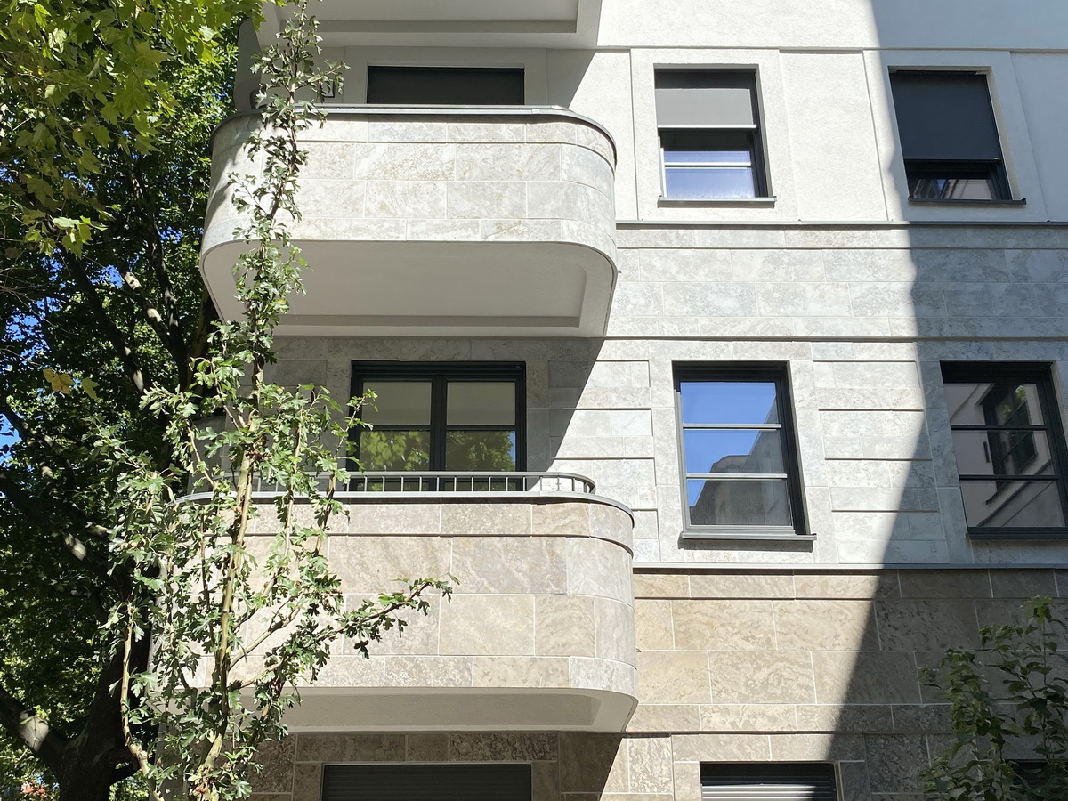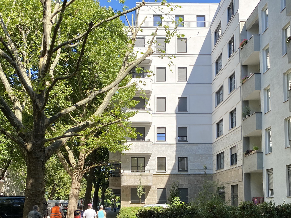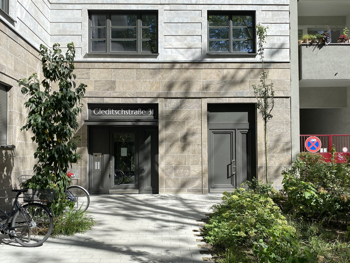 Die Anlage folgt dem klassischen Berliner Blockrand – mit klarer Höhenstaffelung, ruhigen Innenbereichen und Bezug zur gewachsenen Umgebung. Altbauten, Seitenstraßen und Hofsituationen prägen das Quartier rund um das Ensemble. Die Architektur nimmt diese Struktur auf, ohne sie zu imitieren. Auch in der Materialwahl zeigt sich der Bezug zum Ort: Naturstein im Sockelbereich und Putzflächen in abgestuften Farbtönen orientieren sich an der Nachbarbebauung – ruhig interpretiert, aber eigenständig gesetzt. Entstanden ist ein Neubau, der sich in Maßstab und Wirkung einfügt – klar gegliedert, ohne gestalterische Dominanz.