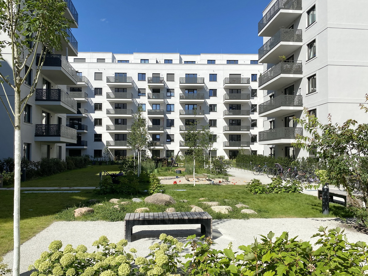 Die Gemeinschaftsbereiche sind repräsentativ gestaltet: Lobbys und Treppenhäuser verfügen über elegante Natursteinbeläge, die Aufzüge sind mit Glas- und Edelstahlflächen ausgestattet. Für nachhaltige Mobilität stehen 79 Tiefgaragenstellplätze mit Wallbox-Vorbereitung für ausgewählte Wohnungen sowie über 400 Fahrradstellplätze mit teilweiser E-Bike-Lademöglichkeit bereit. Herzstück des Projekts ist die rund 2.600 m² große Innenhofanlage mit Spiel- und Erholungsflächen. Ergänzend verfügt das Neubauensemble über eine DGNB-Gold-Zertifizierung.